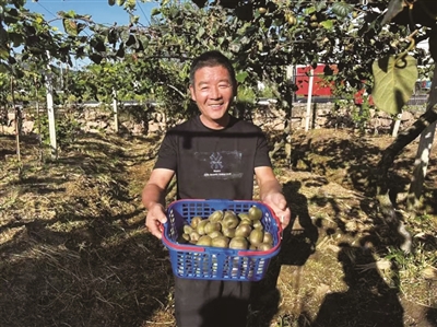 | 岩头镇方岙村种植户向游客展示果园里丰收的猕猴桃。 |