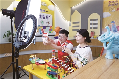 | 永嘉农商银行“金融讲师”协助韩埠村教玩具电商开展直播活动。 |