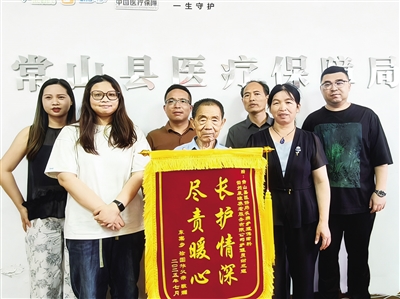 | 常山县东案乡徐国华父亲向长护险工作组赠送锦旗。 姜靓茹 摄 |