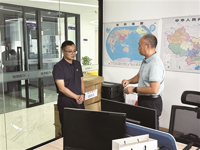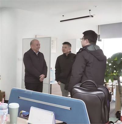 | 舟山市委组织部人才工作处处长王小聪(左)与飞地企业进行交流。 |